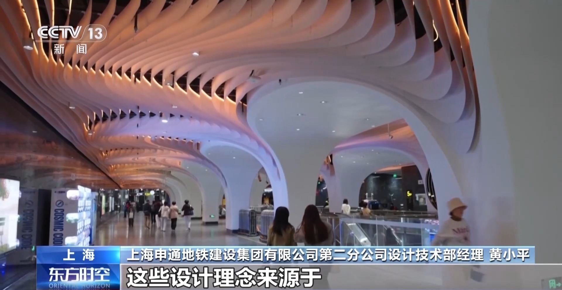上海申通地铁建设集团有限公司第二分公司设计技术部经理 黄小平:柱的边角上有一个弧形的设计,这些设计理念来源于上海老城乡的一些古建筑群的屋檐,就像倒影轮廓一样拍打在柱体上。地铁站整体的色彩是比较丰富的,分为节假日模式和常规的通勤模式,通过色彩的变化体现整个车站一些现代科技的未来感。