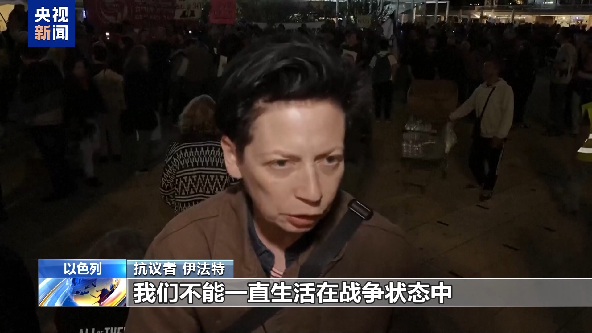 抗议者 伊法特:我们必须达成协议,我们不能一直生活在战争状态中,这根本无法维持。我们绝不能让这种情况继续发生,我们将每周坚持在这里示威,直至我们能推动政府改变,因为我们再也无法维持。我们急需过上没有战争的正常生活,够了,内塔尼亚胡必须下台。