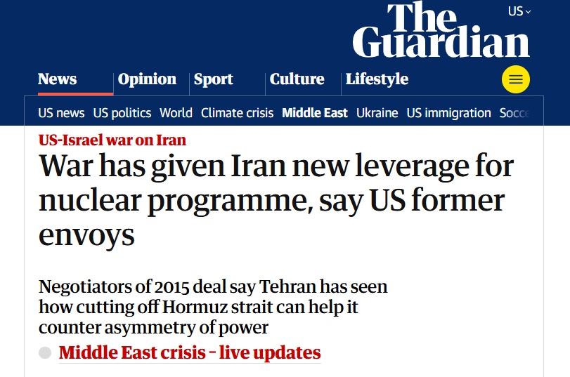 英国《卫报》的报道援引两名参与2015年伊核问题全面协议的美国前特使的观点称,美国和以色列对伊朗的袭击,以及伊朗随后关闭霍尔木兹海峡,为伊朗提供了新的工具和决心,以抵抗美方要求其关闭核计划的压力。