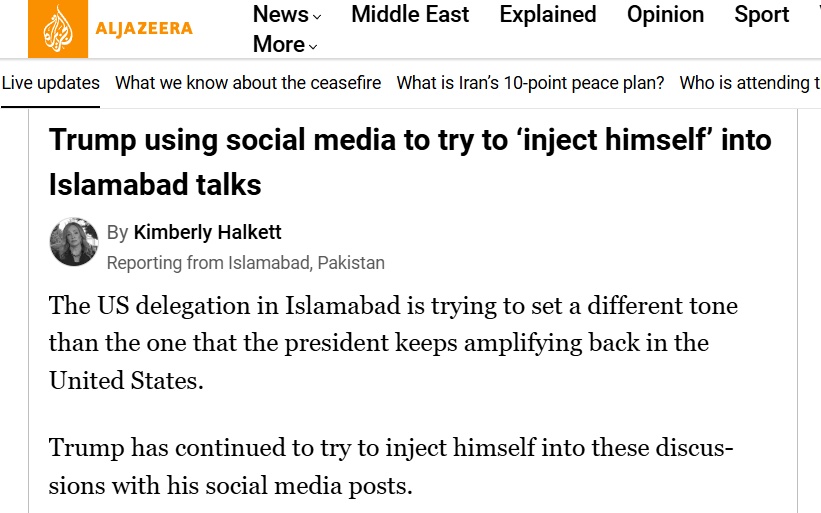半岛电视台网站的一篇报道直接称,“特朗普利用社交媒体试图将自己‘注入’到伊斯兰堡的谈判中”。