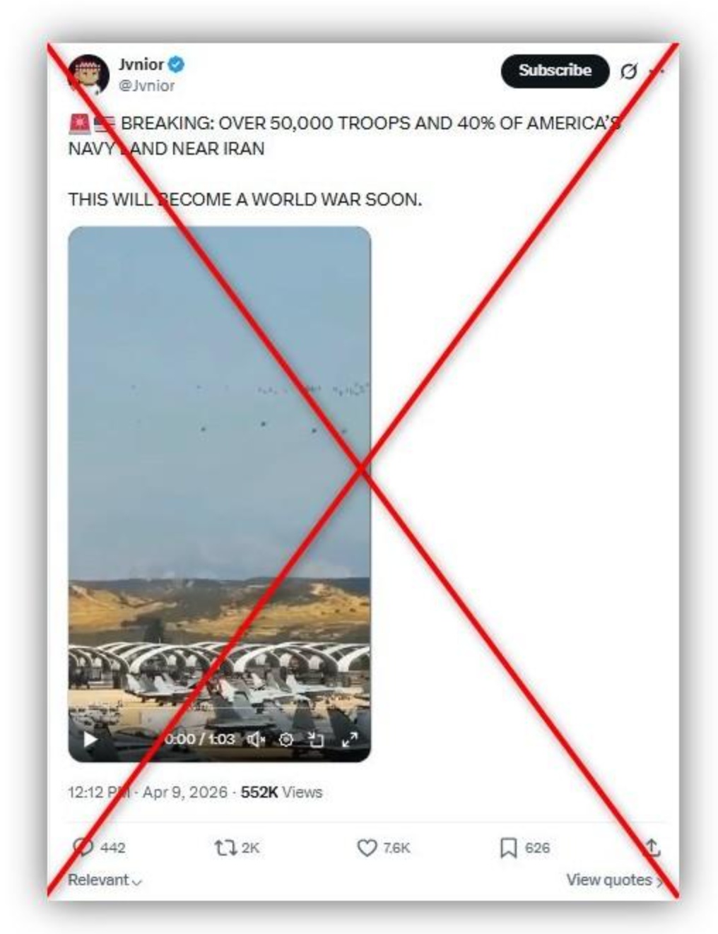 这段时长约1分钟的视频配文称:“突发消息:超5万美军士兵及40%的美国海军力量登陆伊朗附近。这不久将变成世界大战。”