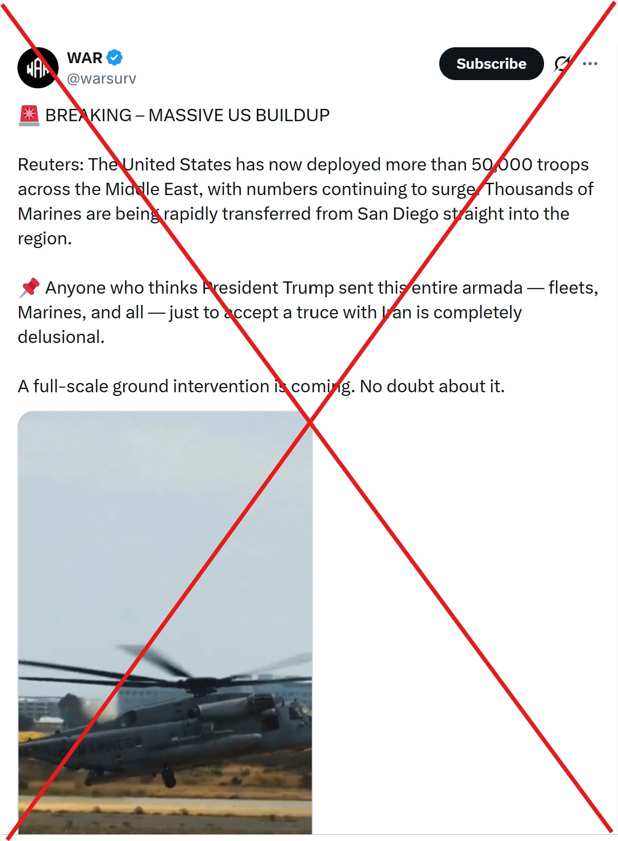 另有社交媒体用户在视频配文中写道:“据路透社报道,美国目前已在中东地区部署超过5万兵力,且人数仍在持续激增。数千名海军陆战队员正从圣迭戈火速调往该地区 。”视频还配上评论称,“若有人认为美国派出海军和海军陆战队,仅仅是为了与伊朗达成停火协议,那简直是痴人说梦。 一场全面地面军事干预即将来临。毋庸置疑。”