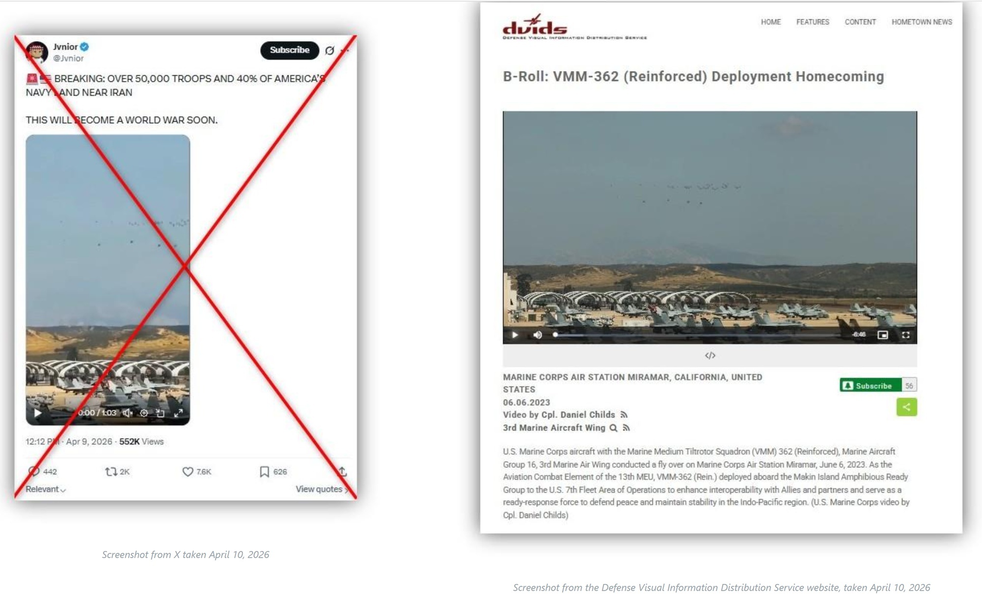 媒体通过反向图片搜索,在美国国防部下属网站“防御视觉信息分发服务”(DVIDS)找到了2023年6月6日发布的文章,其中视频内容与热传视频完全一致。据描述,当时美国海军陆战队第362中型倾转旋翼机中队在加州米拉马航空站进行了飞行表演。