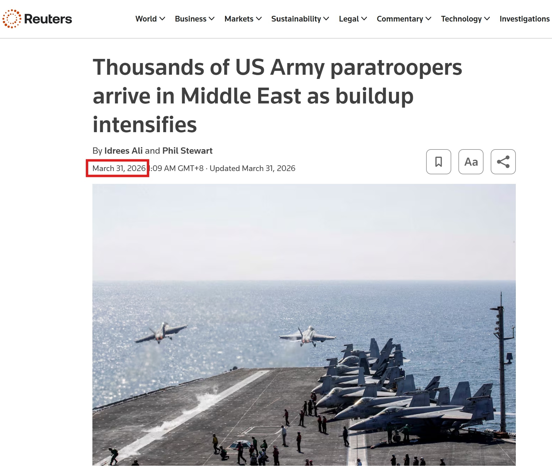 巴基斯坦《论坛快报》也在某海外视频平台发现了2023年6月15日发布的同标题视频。关键词检索显示,路透社等国际主流媒体并无“5万美军增兵”的相关报道,仅查得路透社在今年3月31日的报道中提及“2500余名海军陆战队员抵达中东”,且该报道发布于美伊停火之前。