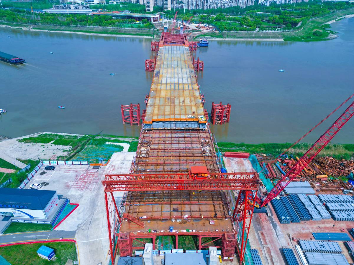 江汉十桥是武汉市规划的第10座跨汉江通道,也是一座钢拱桥,主桥以钢质杆件组合而成,主桥用钢约1.7万吨。主跨380米,其中钢箱梁采用步履式顶推法施工,最大顶推跨径达120米,顶推规模位列国内第二。该桥采用“先梁后拱”施工工艺,中交二航局项目技术团队采用智能应力监测系统,对临时墩沉降、钢箱梁线形进行毫米级精度控制,确保结构受力均衡。