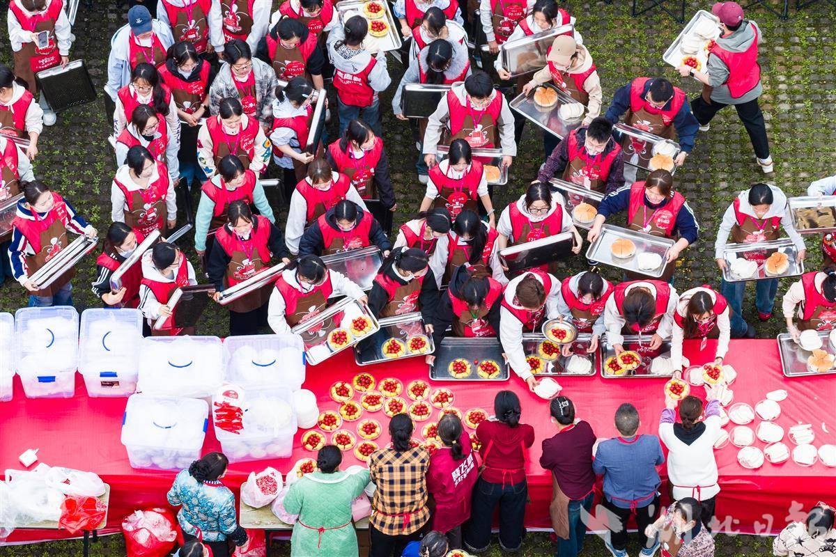4月12日上午,志愿者在终点处准备龙虾宴。(湖北日报全媒记者 任勇 摄)