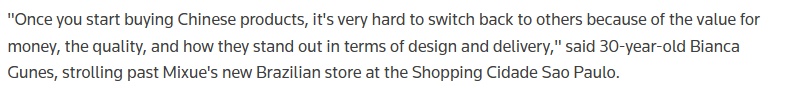 报道指出,近期,一家中国新式茶饮与冰品连锁品牌在巴西开设首店,标志着中国企业新一轮进入巴西市场的重心,已开始面向巴西这个拥有2亿多人口的庞大市场,直接布局消费端。路透社认为,这既是中企海外投资的新阶段,也反映出中国与巴西紧密的经济联系持续巩固夯实。