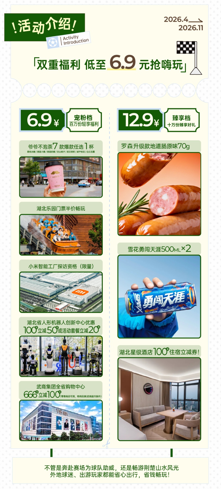 本次活动设置6.9元宠粉档与12.9元臻享档,覆盖美食、游玩、住宿、购物、科创体验等多元场景。6.9元福利套餐内含爷爷不泡茶爆款饮品、湖北多家主题乐园门票半价权益,还可享受武商集团购物优惠,并能预约探访小米智能工厂等,适合本地球迷与学生群体。12.9元套餐则为观赛与出行量身打造,包含特色小吃、品牌啤酒以及湖北星级酒店住宿立减券,为外地球迷与出游玩家提供便捷实惠的食宿保障。