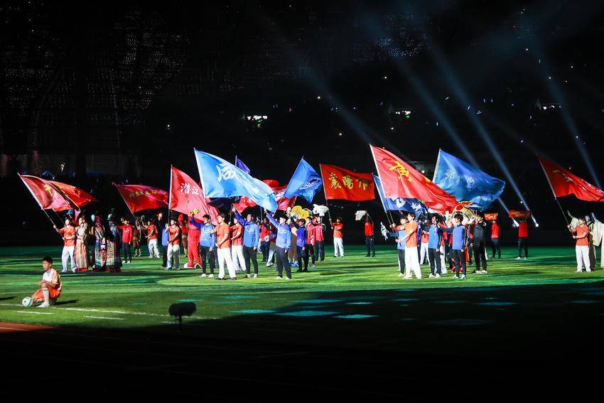 赛前暖场,“体育运动”“历史文化”“城市发展”“文明新城”等四大主题方阵依次巡游展演,随后的文艺表演突出时代、足球、文化、科技和地域五大特色。