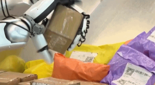 总台记者 张景:这款机器人上赛道可以奔跑,装上灵巧手可以做快递分拣,它把面单朝上放在履带上,便于后续的扫描、录信息,这里有盒子、包裹,大小不一,重量都不同,它都可以轻松拿起来,双手协作进行翻转,特别灵敏,拟人化特别高,如果把包裹拿远一点,识别出来之后,仍然把面单朝上,不会遗漏。