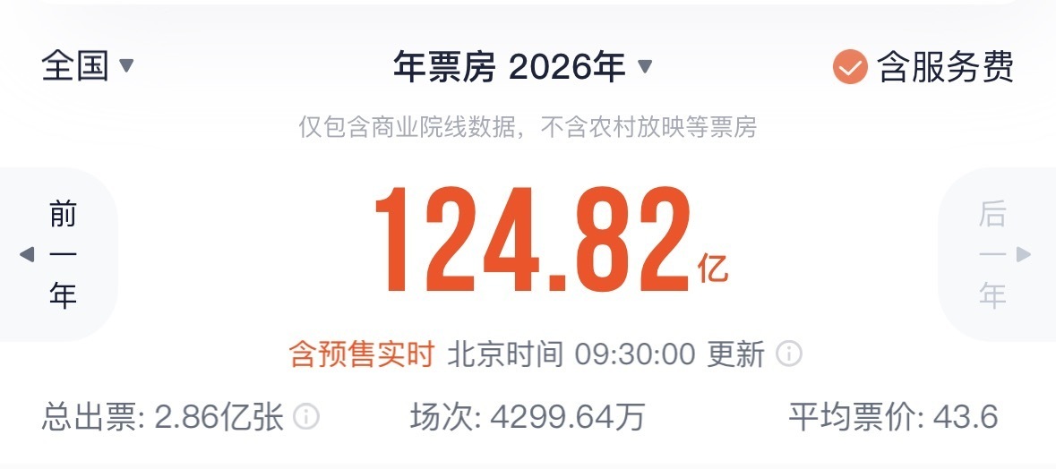 据平台数据显示,截至今日(13日)9时30分,2026年度全国电影总票房已超124.82亿元。