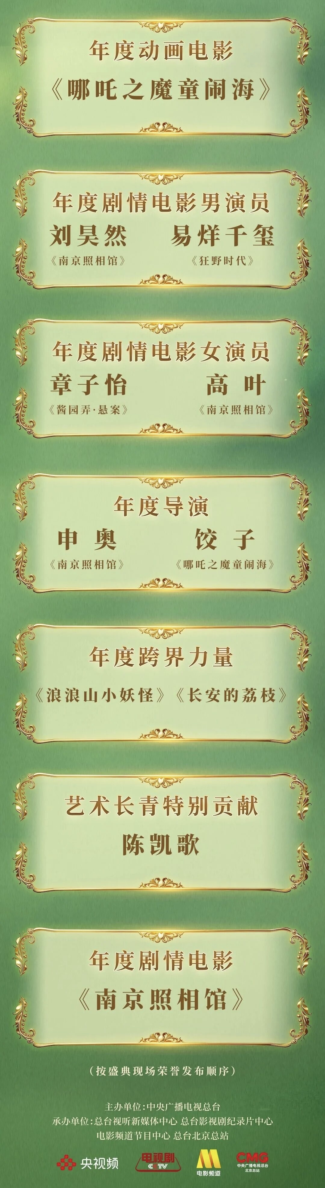 动画巨制《哪吒之魔童闹海》荣获年度动画电影、年度导演及年度视觉效果三项荣誉。出品人王长田表示,再高的电影票房纪录都会被打破,只有好的电影才会永远留在观众的心中,无法被取代。