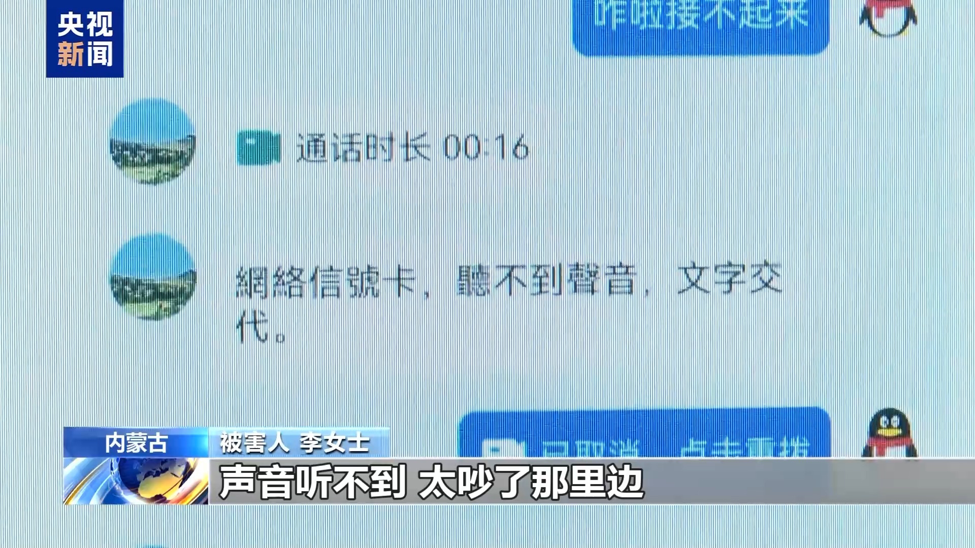 被害人 李女士:跟我视频,没等我接起来就没了,紧接着又跟我视频一次,我还是接不起来。第三次给我打视频,我接起来16秒钟看到他的头像,头比较大,背景都看不到,声音听不到,太吵了,他说网络信号卡,听不到声音,文字交代,他就给我打字。