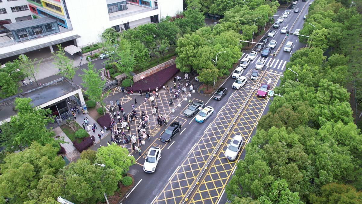 该校每日7:40-8:20有近2200名学生集中上学,送学车辆与过境车辆争夺道路资源,挤占通行空间。三大症结交织难解:送学与过境车流瞬时扎堆致道路饱和,周边道路施工进一步加剧通行效率下降,车辆临停下人造成人车混行秩序混乱。