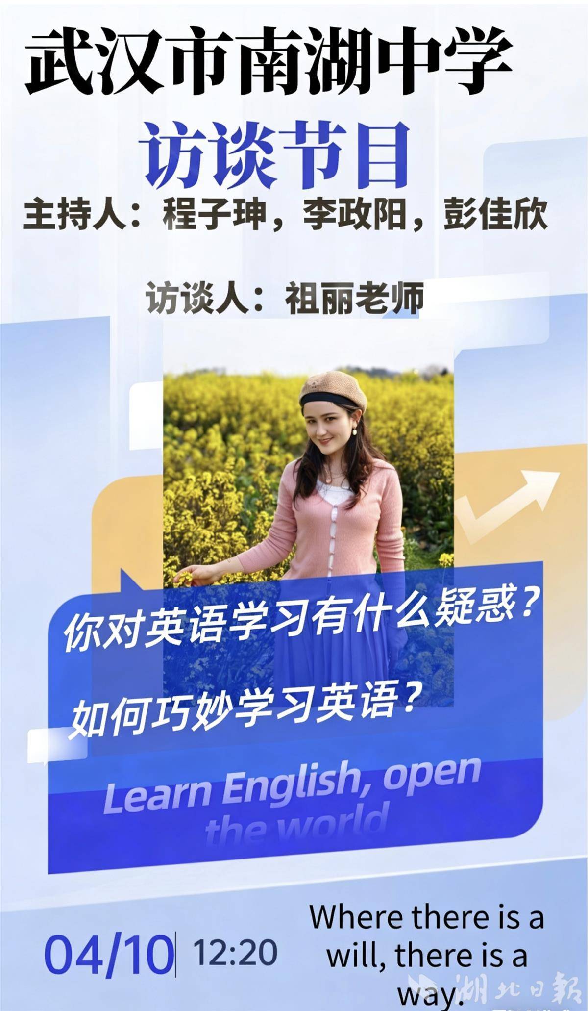 “老师,请您听我一问!”近日,连续三周,每周五中午,武汉市南湖中学校园广播里都会响起这句开场白。电波串联起三场师生对话,历史、物理、英语三位老师先后走进广播站,接受学生主持人的访谈。不少学生原本觉得枯燥的学科,在一问一答间,变得有意思起来。