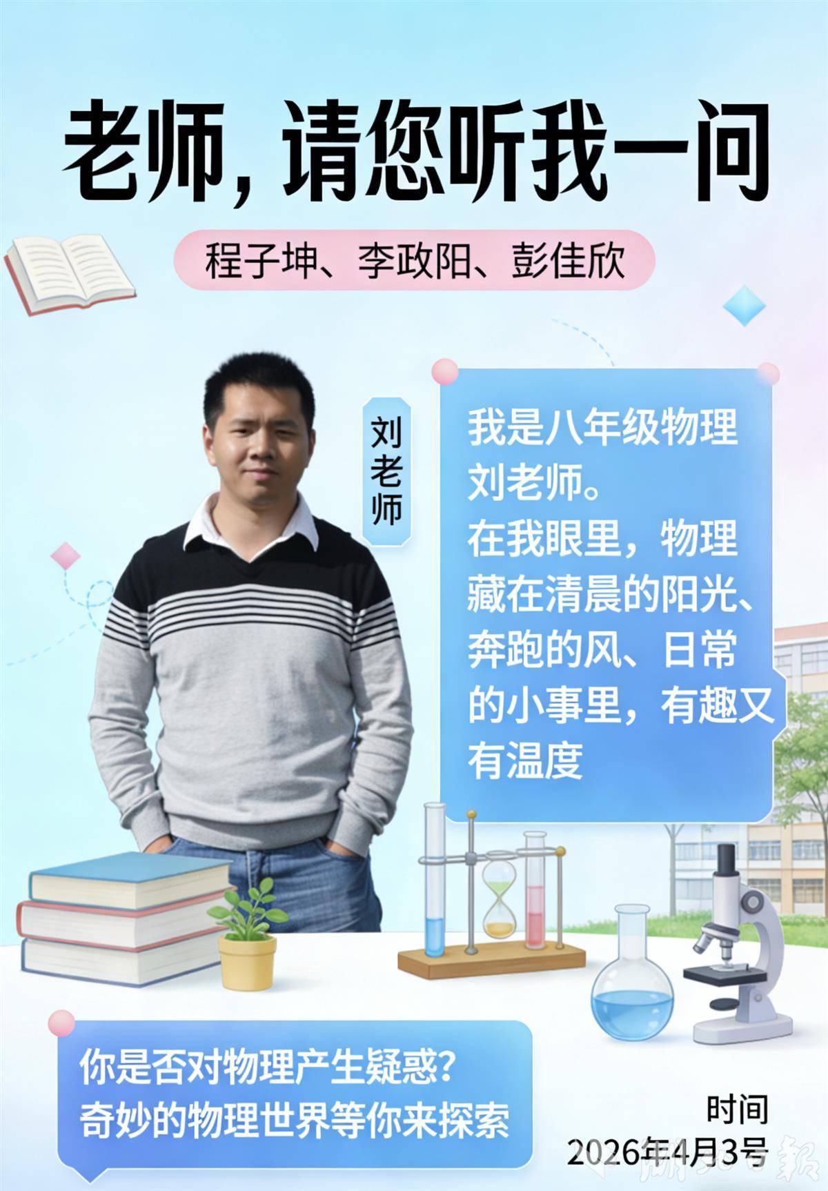 第二周,物理老师刘晖来了。有学生觉得物理难,他就从身边小事说起:“清晨的阳光为什么是斜的?倒热水时杯子为什么容易炸?”他说,物理就藏在日常小事里,有趣也有温度。他鼓励大家多观察,说“好奇就是最好的老师”。主持人程子坤说,以前觉得物理就是算算算,现在发现走路、喝水全是物理。还有学生在作业本上写:“刘老师让我觉得,物理不冷。”