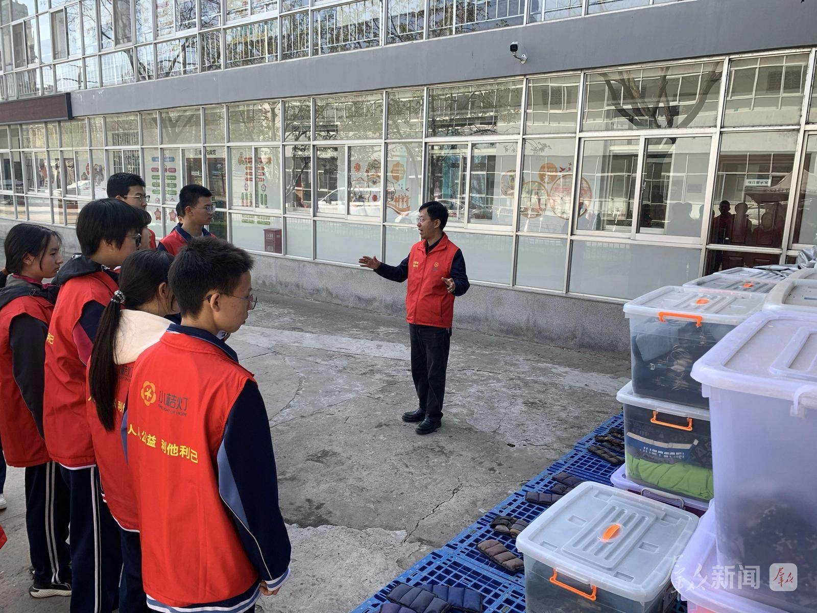 4月1日,在咸阳市小桔灯公益服务中心,郭恩伟(右一)向同学们介绍募捐衣物箱的整理方法及用途。