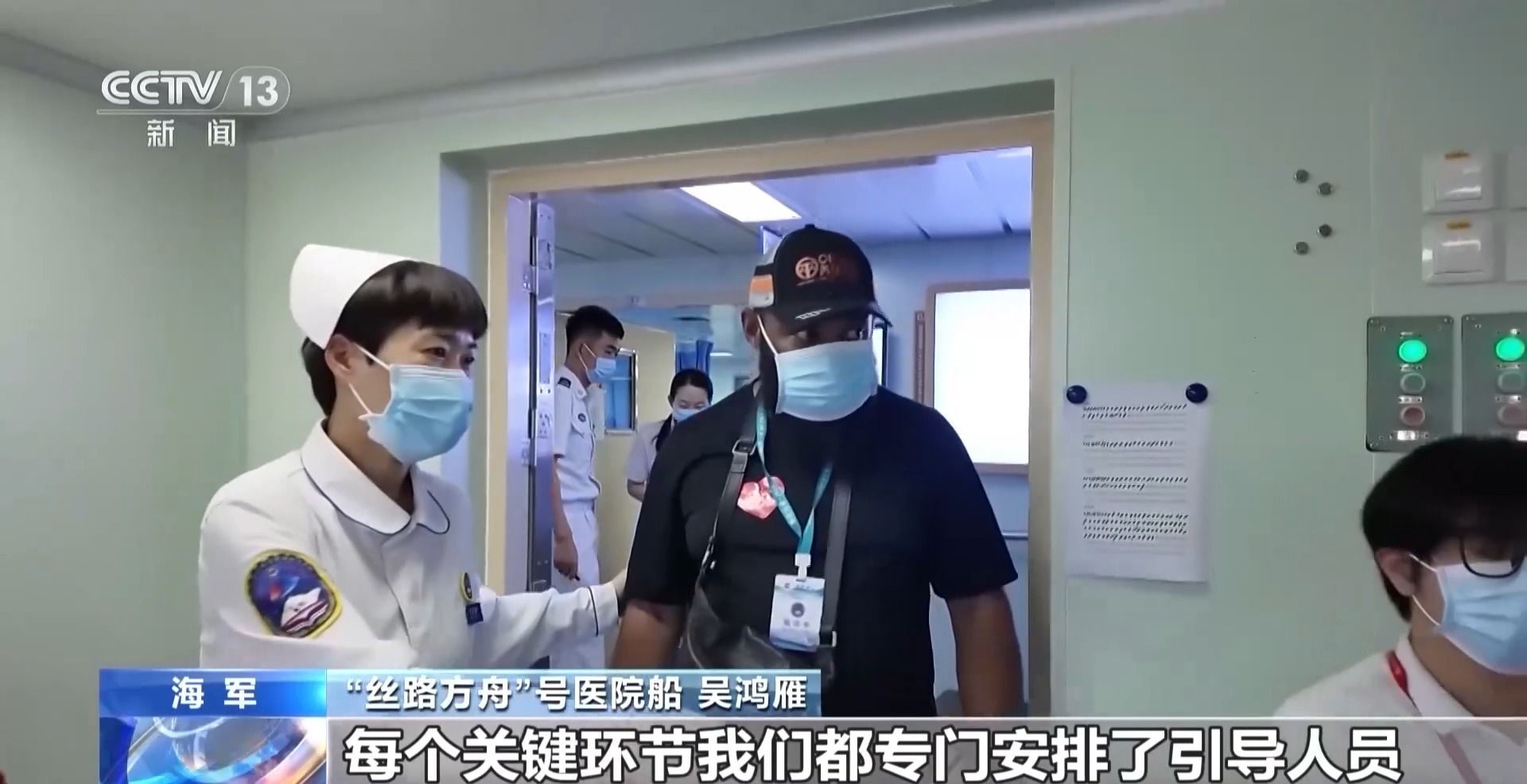 “丝路方舟”号医院船 吴鸿雁:从预检分诊到就诊检查,再到药品发放,每个关键环节我们都专门安排了引导人员,形成了“入口有指引、流转有衔接、离场有引导”的全程引导体系,化解了当地民众因语言不通、流程不熟带来的不便,最大限度提升了诊疗效率。
