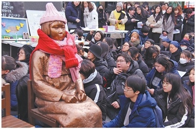 韩国民众在首都首尔一处象征日军“慰安妇”受害者的“和平少女”雕像周围举行抗议活动。本报记者 陈尚文 摄