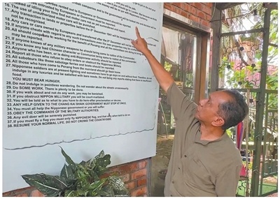 马来西亚槟城战争博物馆创建者佐哈里在展板前介绍日军占领槟城后发布的“38项严令”。本报记者 白元琪 摄