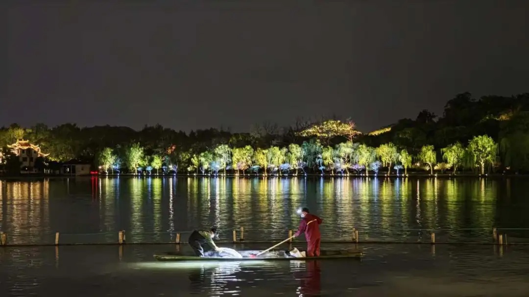 4月11日凌晨,记者在杭州西湖岳湖“荷区清塘”现场看到,工作人员正两人一组乘船作业,对没有游出荷区的鱼及时清捞,放入菱桶内保活,后续放生到荷区外的普通湖区。