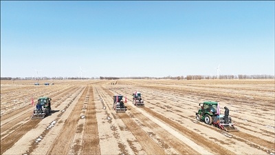 田垄绵延向远方,春耕机鸣声声不息。播种轮碾过黝黑的沃土,在辽西大地上勾勒出现代农业的轨迹。