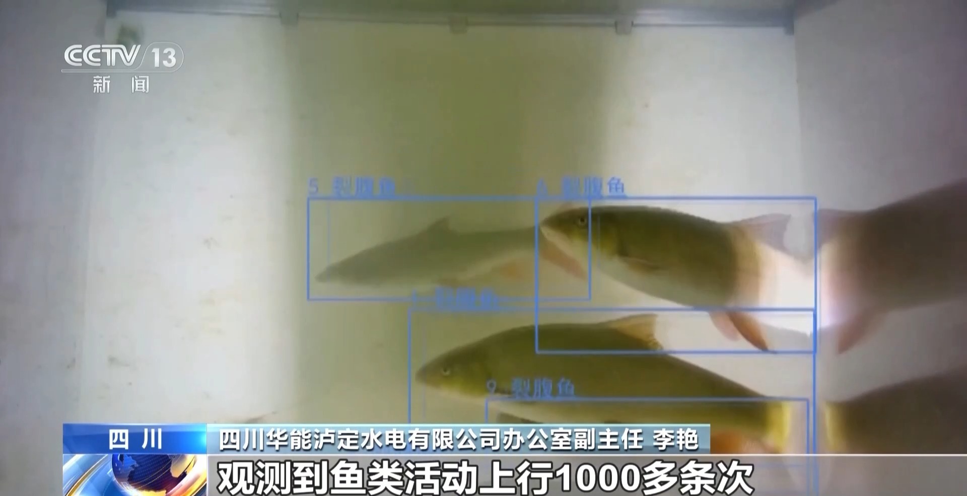 四川华能泸定水电有限公司办公室副主任 李艳:自鱼道去年3月份启用以来,在鱼道已经观测到鱼类活动上行3000多条次,下行2000多条次,特别是最近一个月观测到鱼类活动上行1000多条次。