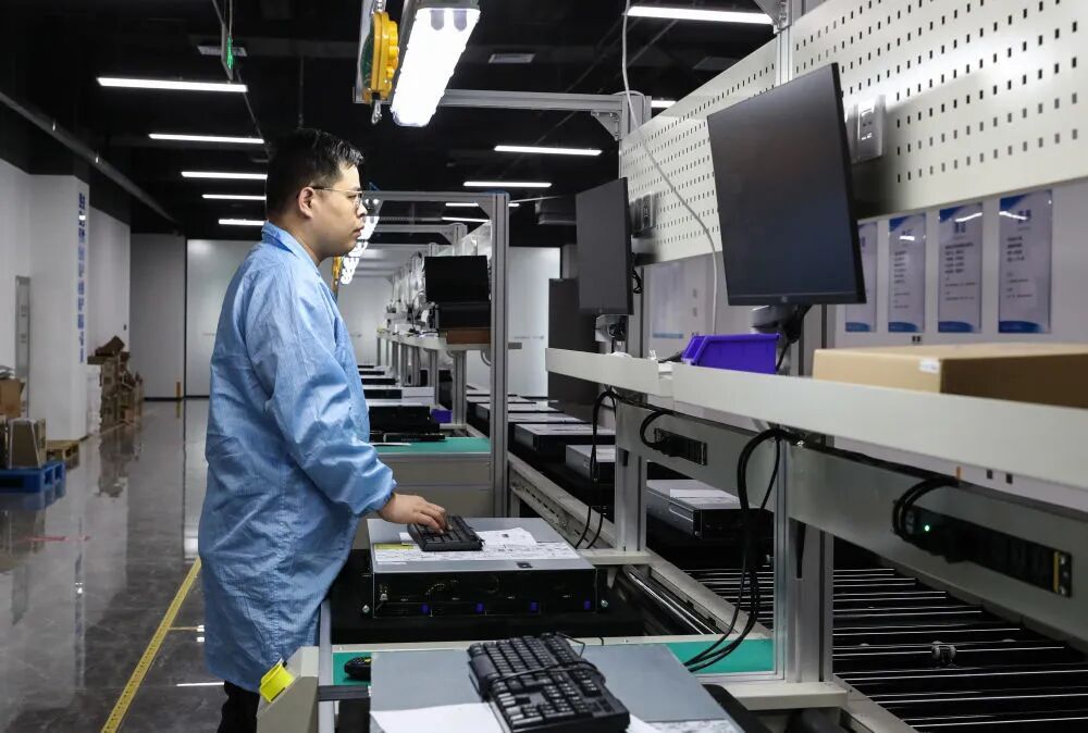 2024年2月28日,在位于廊坊三河市的京津冀国家技术创新中心燕郊中心,联泰集群算力(三河)科技有限公司的工作人员对装配好的产品进行检验。新华社记者 单宇琦 摄
