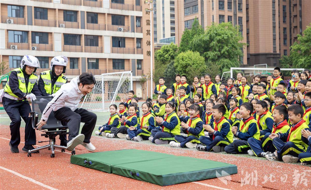 民警正在给同学们模拟乘车未系安全带的危险后果。