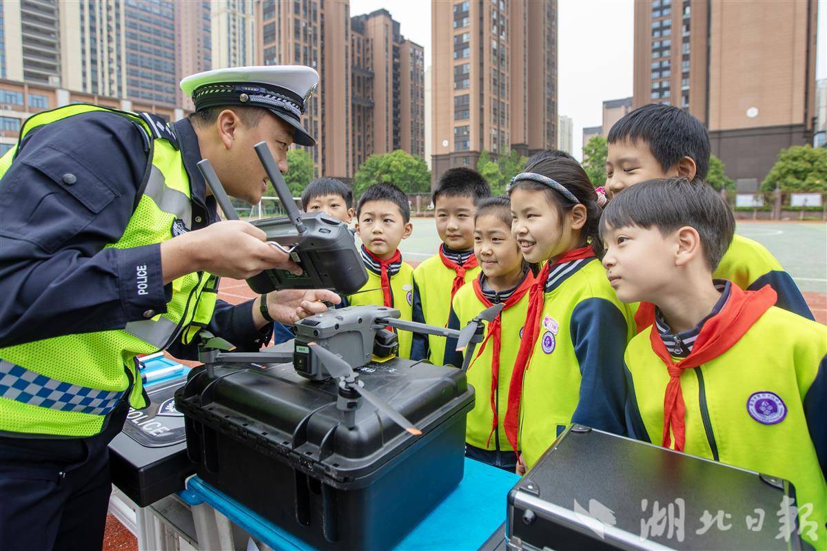 民警正在给学生们展示警用无人机,让学生沉浸式学习安全知识。