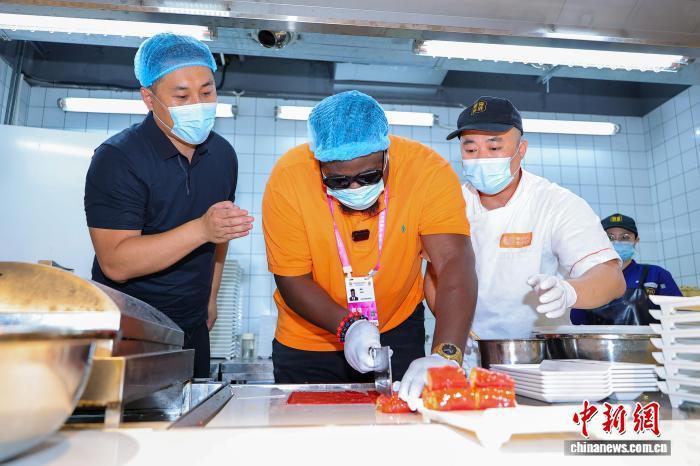 4月13日,尼日利亚籍主播博密(OLUWABUNMI HENRY JIMOH)在海口骑楼老街的椰城喜鹿老爸茶店里,尝试制作红米肠粉。中新网记者 骆云飞 摄