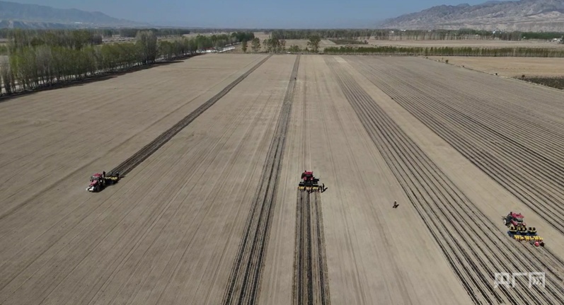 种植户使用大型农机开展机械化铺膜播种作业 (吾兰 摄)