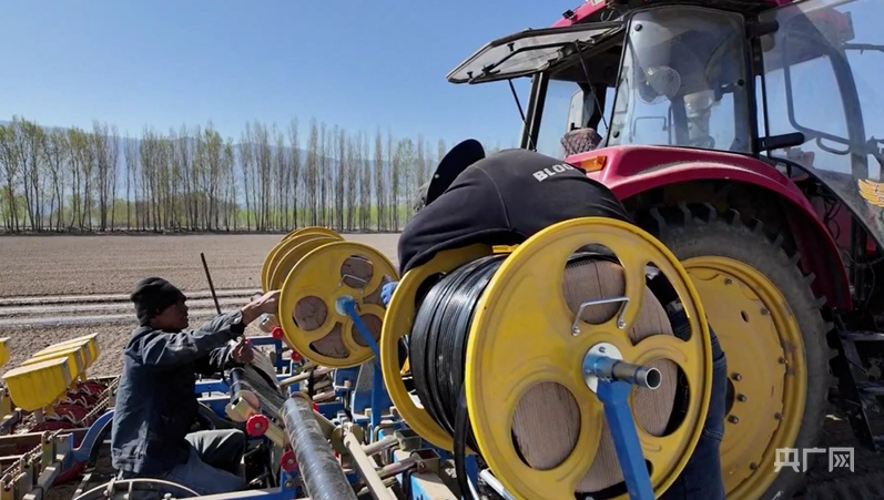与传统人工铺膜相比,机械化作业优势尽显。一台农机一天便能完成数十亩地的铺膜、铺滴灌带、打孔全套作业,效率是人工的3至5倍。这不仅大幅缩短了春播周期,更为后期洋葱的高产优收筑牢了坚实基础。特克斯县乔拉克铁热克镇农机大户焦富裕一边专注地盯着农机作业,一边说:“三台机器在作业,播种、铺膜、滴灌带一次性完成,一台机器一天能种80至90亩。”