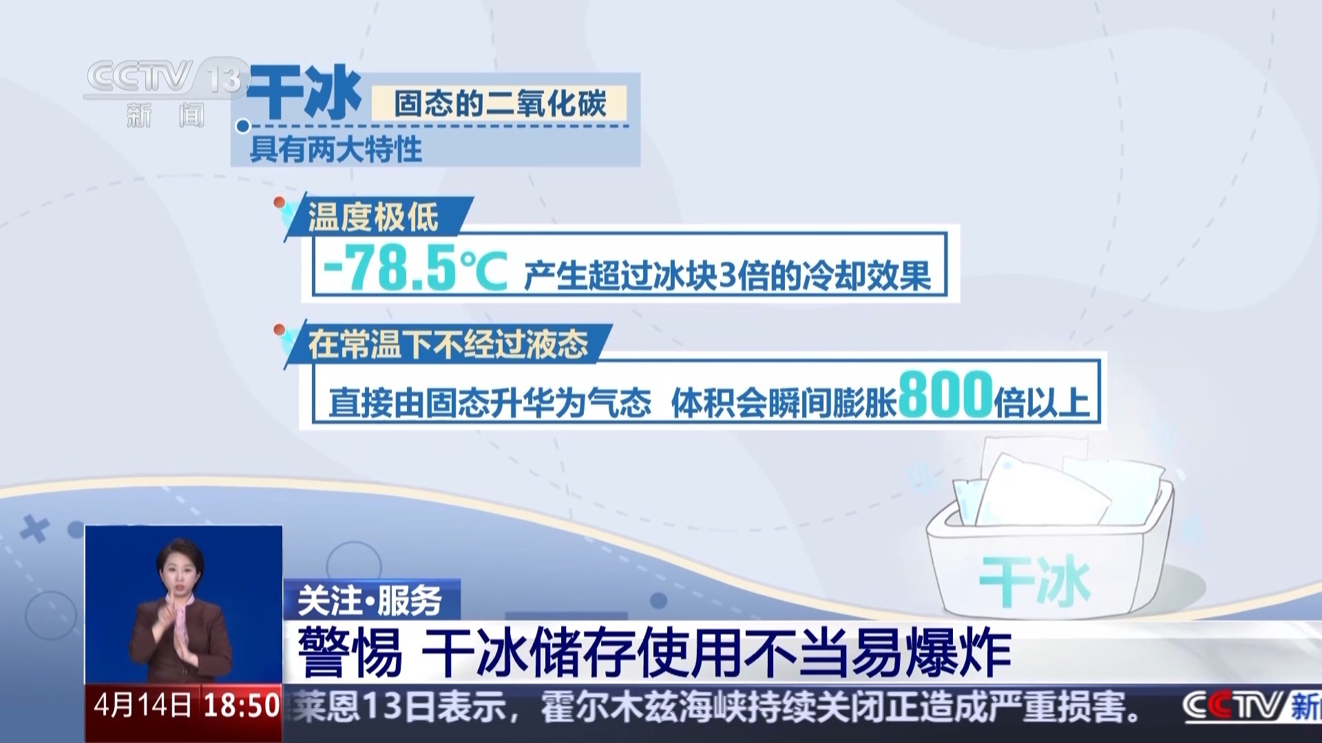 对此,消防部门介绍,很多人误以为干冰只是“很冷的冰”,实际上,干冰是固态的二氧化碳,它具有两大特性:一是温度极低,达到-78.5℃,可产生超过冰块3倍的冷却效果;二是干冰可以在常温下不经过液态,直接由固态升华为气态,但体积会瞬间膨胀800倍以上。这意味着,哪怕是一小块干冰放在密闭容器中,也会在短时间内产生巨大的压力。
