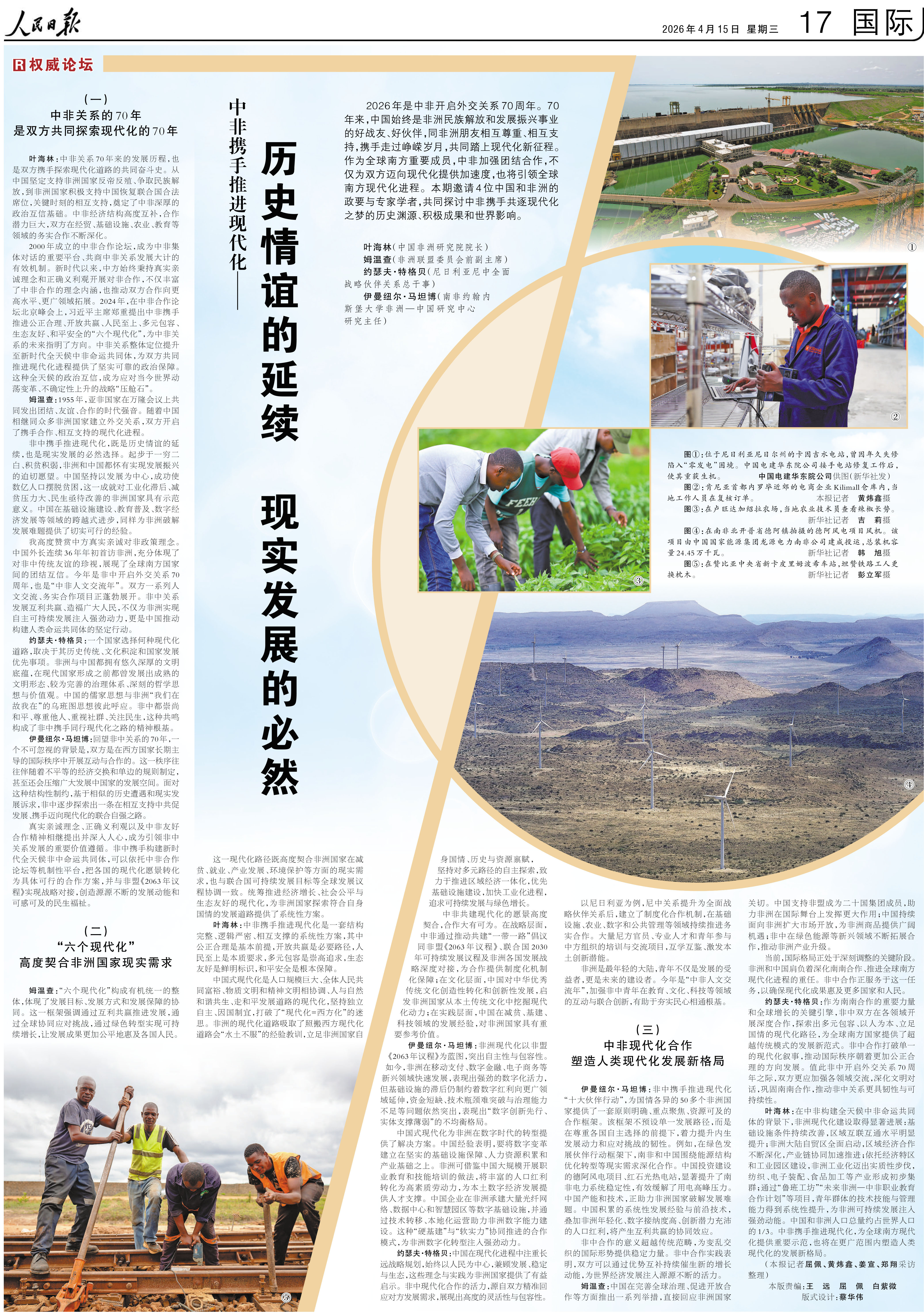 叶海林:在中非构建全天候中非命运共同体的背景下,非洲现代化建设取得显著进展:基础设施条件持续改善,区域互联互通水平明显提升;非洲大陆自贸区全面启动,区域经济合作不断深化,产业链协同加速推进;依托经济特区和工业园区建设,非洲工业化迈出实质性步伐,纺织、电子装配、食品加工等产业形成初步集群;通过“鲁班工坊”“未来非洲—中非职业教育合作计划”等项目,青年群体的技术技能与管理能力得到系统性提升,为非洲可持续发展注入强劲动能。中国和非洲人口总量约占世界人口的1/3。中非携手推进现代化,为全球南方现代化提供重要示范,也将在更广范围内塑造人类现代化的发展新格局。