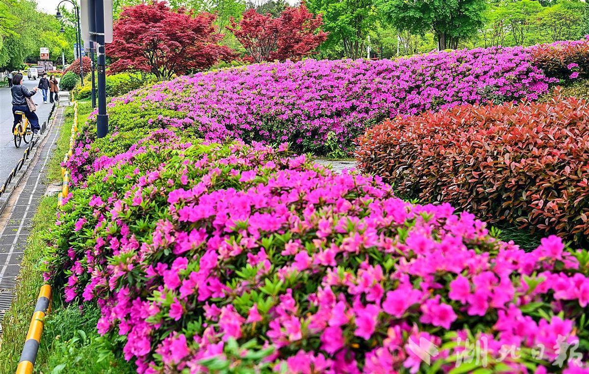 4月14日,武汉东湖磨山脚下的绿道旁杜鹃花现已竞相开放。