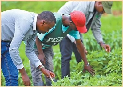 在卢旺达加绍拉农场,当地农业技术员查看辣椒长势。