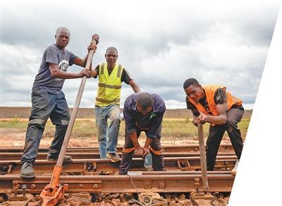 在赞比亚中央省新卡皮里姆波希车站,坦赞铁路工人更换枕木。