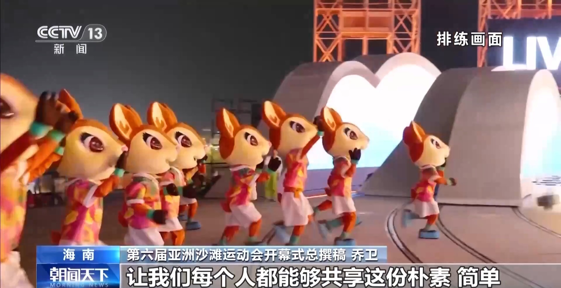 第六届亚洲沙滩运动会开幕式总导演 章东新:这一次的开幕式,你都会觉得它和我们以往的运动会开幕式不太一样,它真的像在沙滩上。运动员入场,我们叫踏浪而来,海浪屏一打开,“亚亚”骑着沙滩摩托进来,然后运动员就从海边过来。全国各地的热爱沙滩运动的青年以及全世界的友好的客人们、青年们在这汇聚,表达沙滩阳光下的那种热情,那种体育的活力、人的生命的活力。