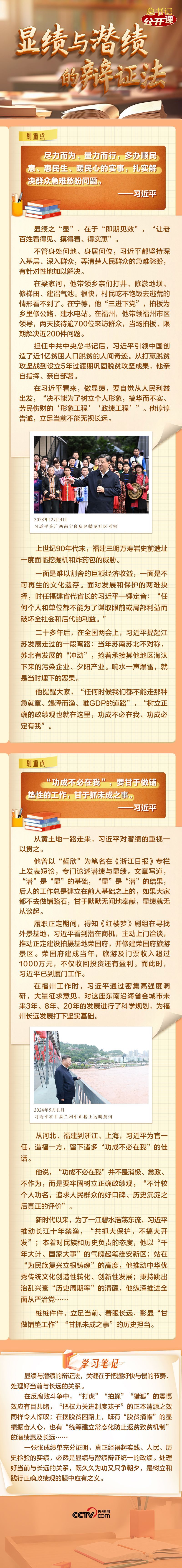 总书记强调“既要做显功,也要做潜功”,就是要求党员干部在干事创业过程中正确把握显绩与潜绩的辩证统一,“既要多办一些近期能见效的大事、好事,又要着眼长远、着眼根本,多做一些打基础、做铺垫的事,前人栽树、后人乘凉的事,创造实实在在的业绩”。