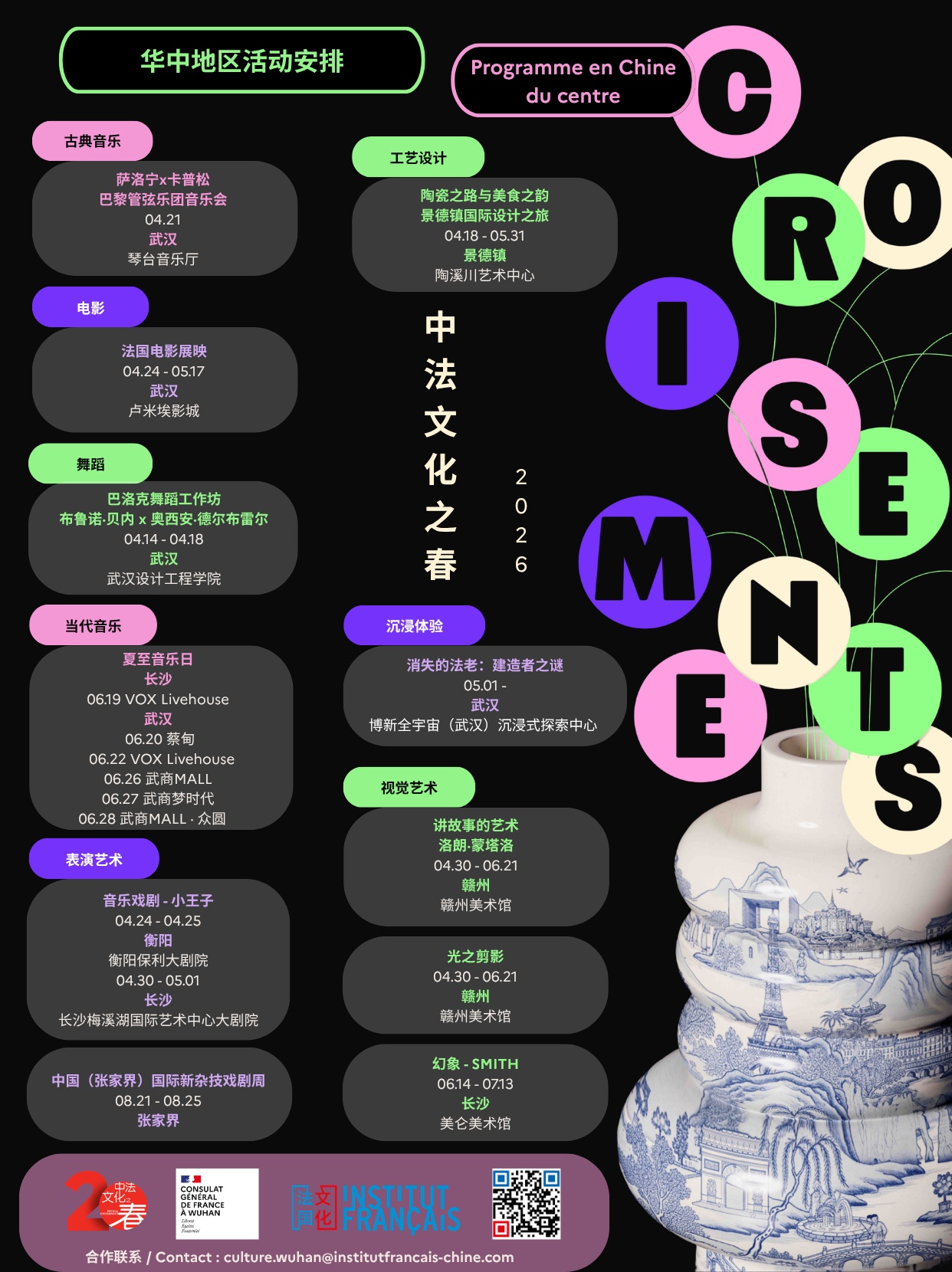 本届中法文化之春的视觉形象以“瓷婚”为灵感而创作,致敬这一在中欧历史往来中扮演了重要角色的材质。法国驻武汉总领事馆文化专员Thomas Penot裴诺现场介绍了华中三省(湖北、湖南和江西)的全部活动。4月至8月,近二十场文化艺术活动将在武汉、长沙、张家界、景德镇、赣州、衡阳等6座城市陆续展开,涵盖古典音乐、电影、舞蹈、视觉艺术、表演艺术、工艺设计、当代音乐等多个领域。