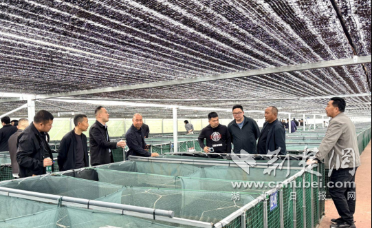 与会人员实地观摩了钟祥市石门水库黄鳝大棚工厂化养殖基地、长寿镇钟祥市瑞鸿源水产养殖专业合作社“两虾一稻”模式养殖基地,详细了解黄鳝大棚工厂化养殖的设施建设、温控管理、循环水处理等技术要点,以及“两虾一稻”模式的田间布局、虾苗投放时序、茬口衔接及效益分析等现代化养殖模式。