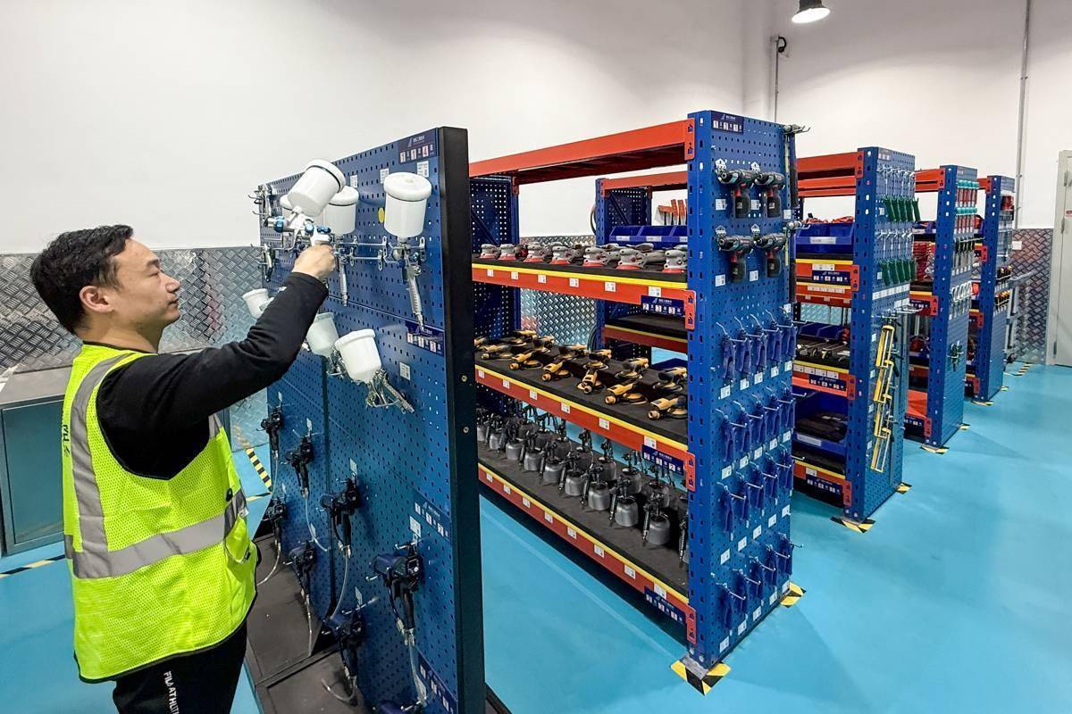 4月15日,南航湖北喷漆机库在天河机场建成投用,图为工作人员整理喷漆工具。(湖北日报全媒记者 倪娜 摄)