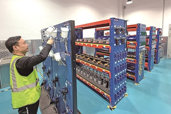 工作人员整理喷漆工具