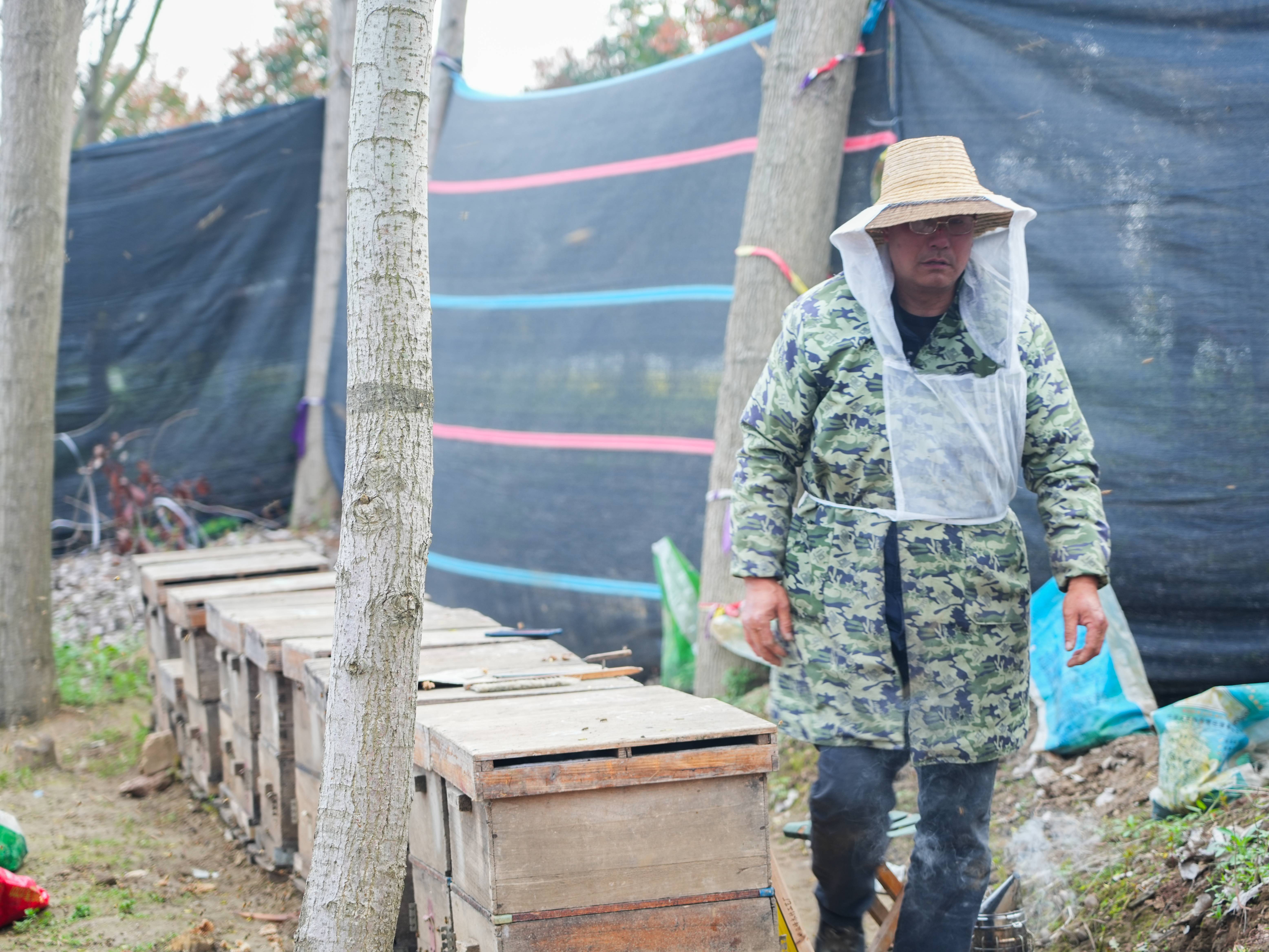 “蜜蜂死了一半。”3月24日,钟祥市皇庄街道汉江边的树林中,看着一排排蜂箱,蜂农张继旺十分伤心。64岁的张继旺是钟祥柴湖镇人,养蜂20多年。今年,他养了120箱蜜蜂,1月初从柴湖镇转场到皇庄街道,吃住在10平方米的棚子中,盼望能“守”个好收成。