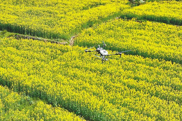 油菜无人机打药,在荆门普及率达90%。(湖北日报通讯员 李翊嘉 供图)