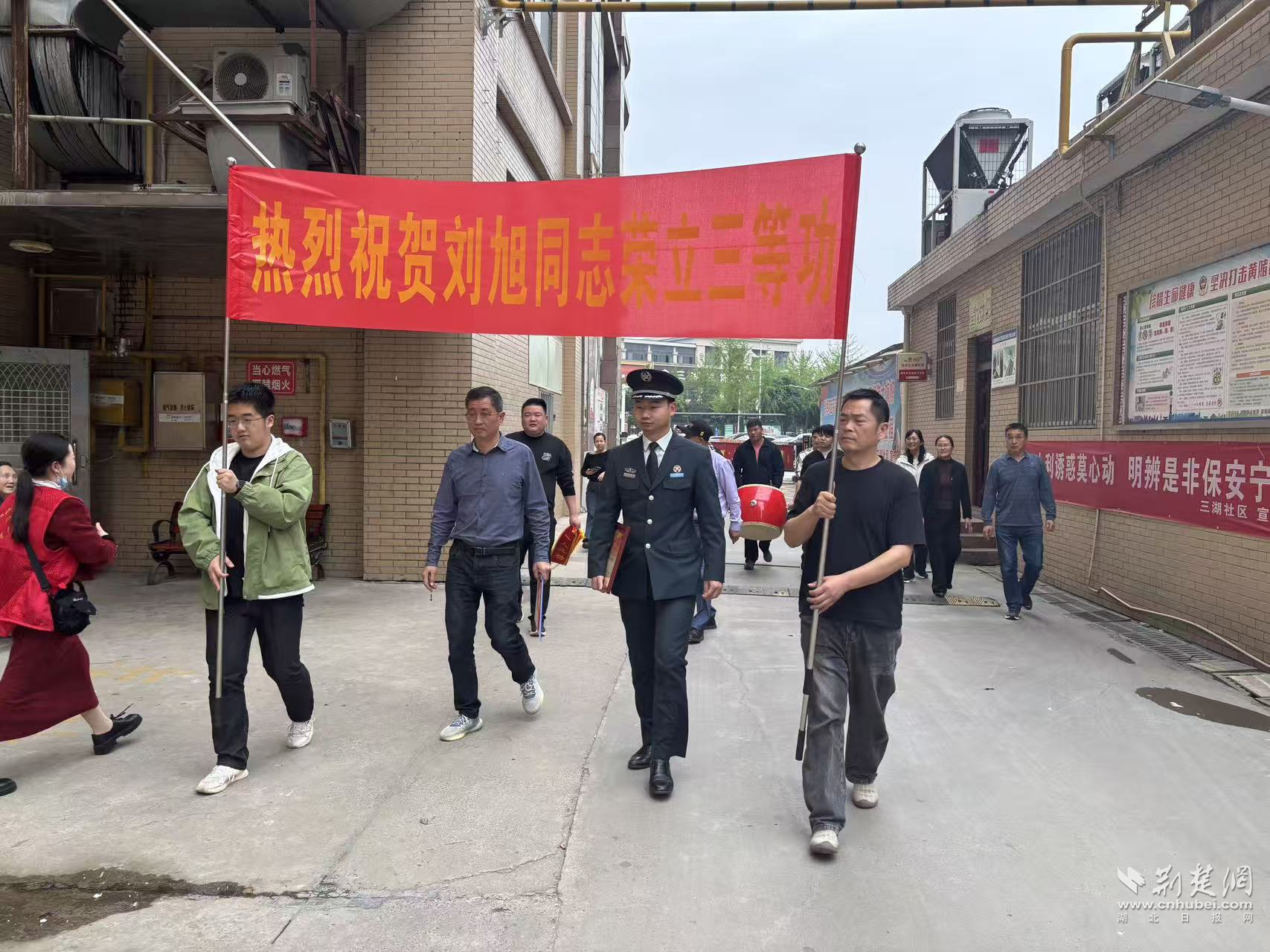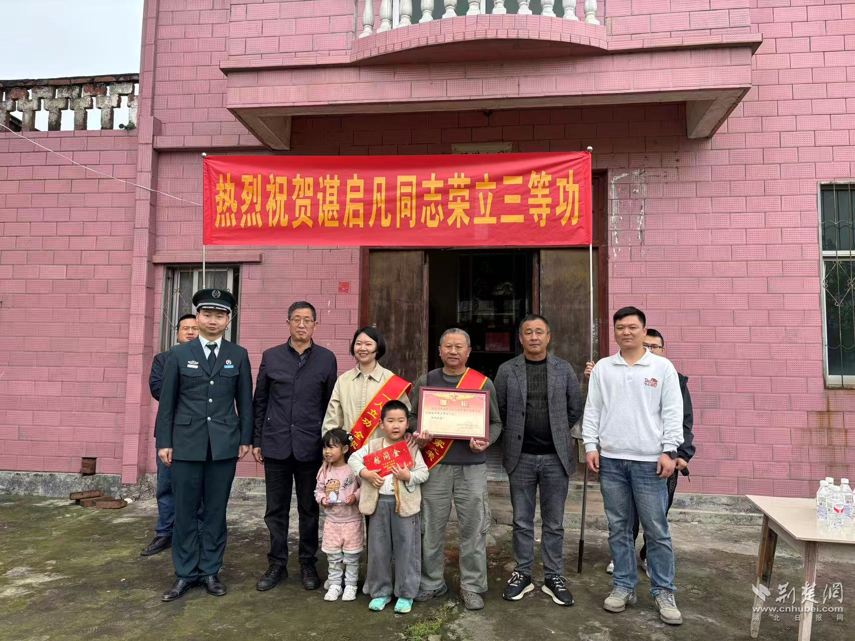 在簰洲湾镇簰洲村郭钊、新洲村谌启凡和殷德容家中,在鱼岳镇刘旭、张俊、王朕、马骏超家门前,喜庆锣鼓与乡亲掌声交织成动人乐章。军地领导为军属们佩戴“一人立功、全家光荣”的鲜红绶带,郑重颁授立功喜报和慰问金。