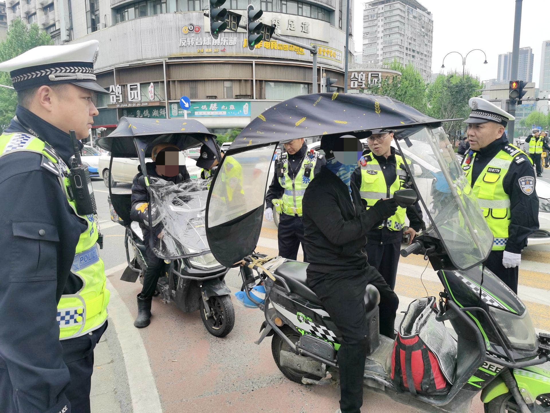 新洲大队在邾城摩尔城路口查处电动自行车加装篷伞、闯红灯等行为,累计劝导骑行人员签订文明交通承诺书150余份。