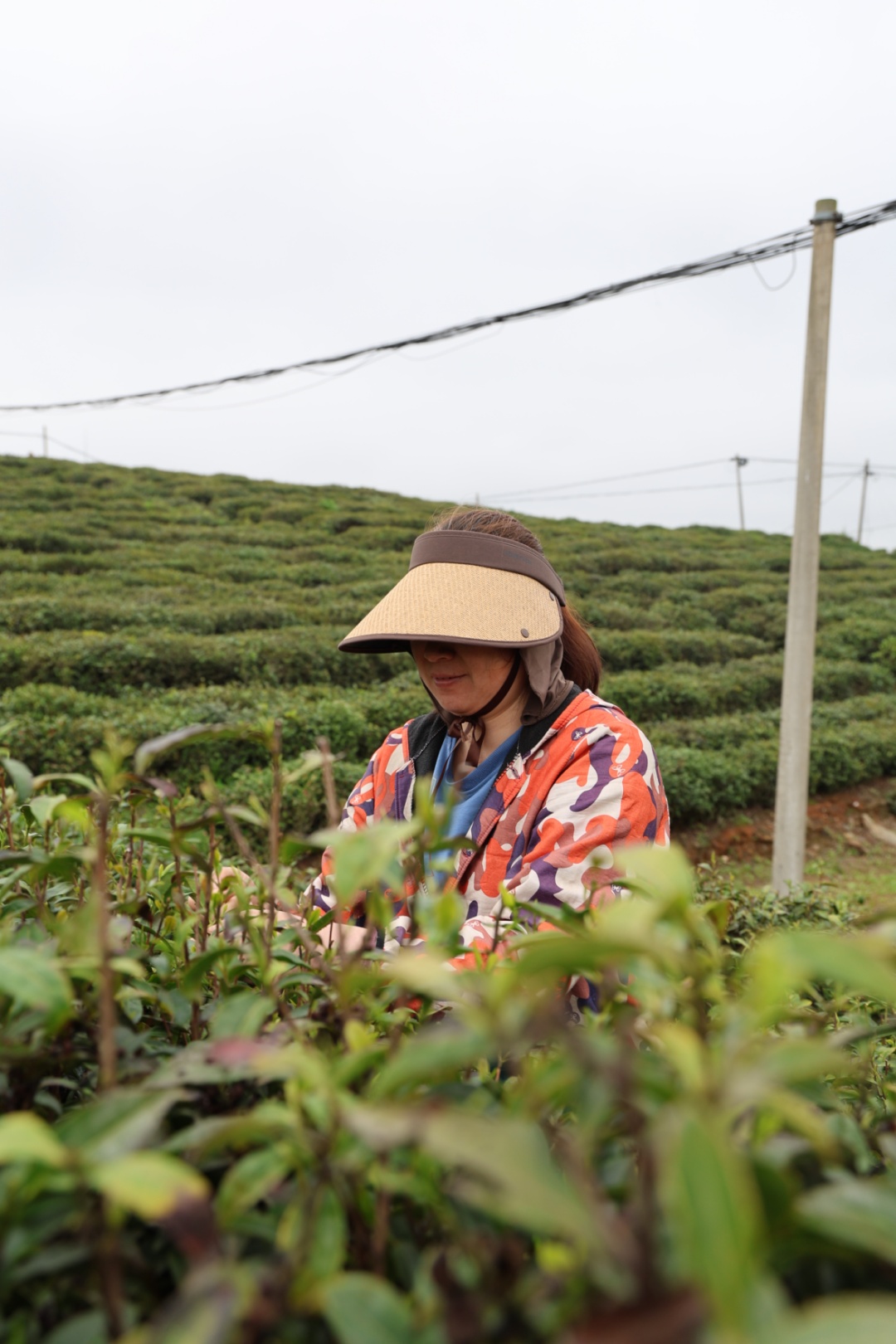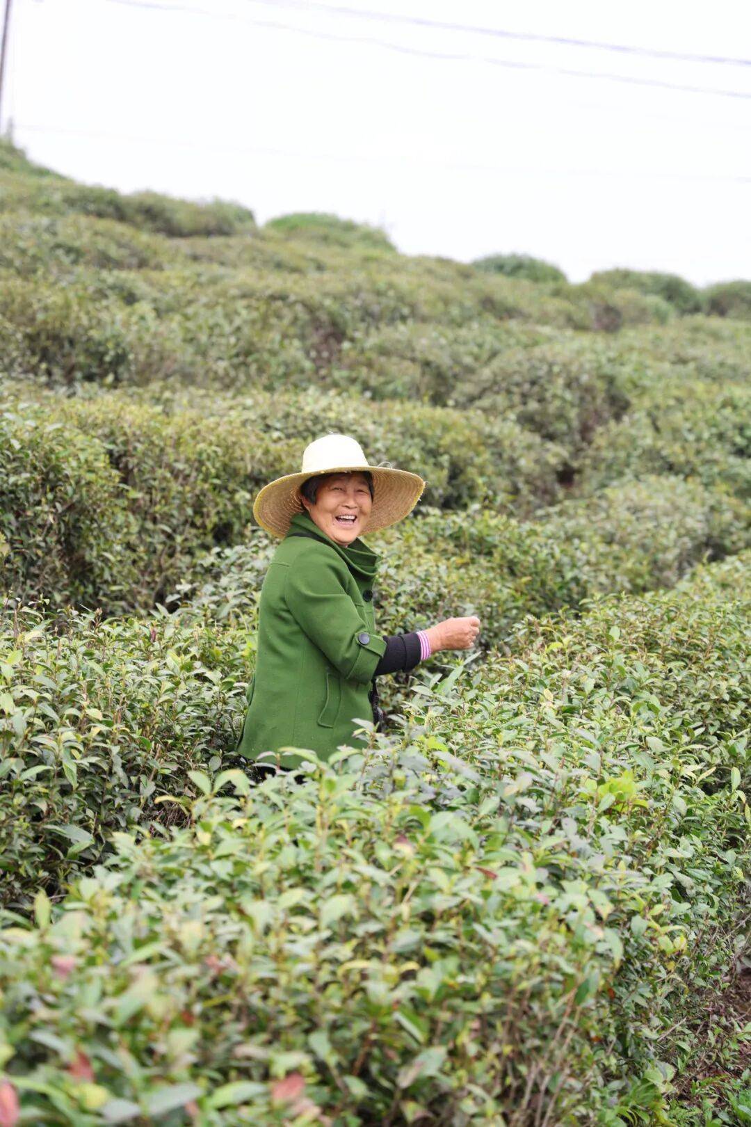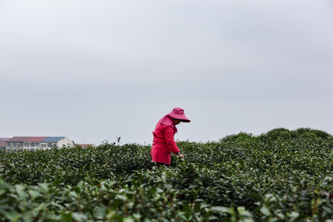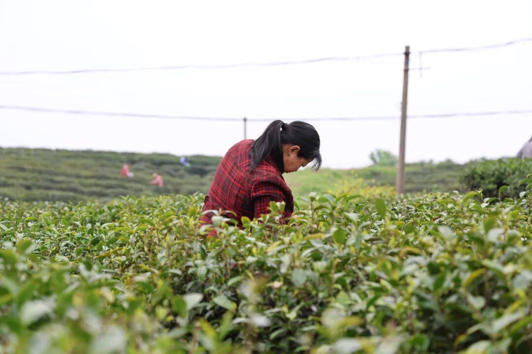 茶垄间,身影错落有致。有人戴着宽檐遮阳帽,指尖在茶枝间灵巧翻飞,一掐一提间,鲜嫩的芽叶便簌簌落入掌心,动作娴熟得与茶树融为一体;有人身着红衣,挎着竹篓俯身劳作,鬓角的碎发被风拂动,笑意藏在眉眼间,混着茶香漫成温柔的春日光景;还有人戴着草帽,在层层叠叠的茶丛中若隐若现,只留下专注的侧影,与这片绿意相融相生。她们的指尖沾着茶汁,掌心覆着薄茧,每一次采摘都藏着经年累月的匠心,把大别山的春与土,都揉进了这一芽一叶里。