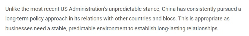 文章说,与美国政府近期反复无常的外交风格不同,中国在处理与各国及集团关系时始终秉持长期稳定的政策取向——这对企业建立持久合作关系至关重要。